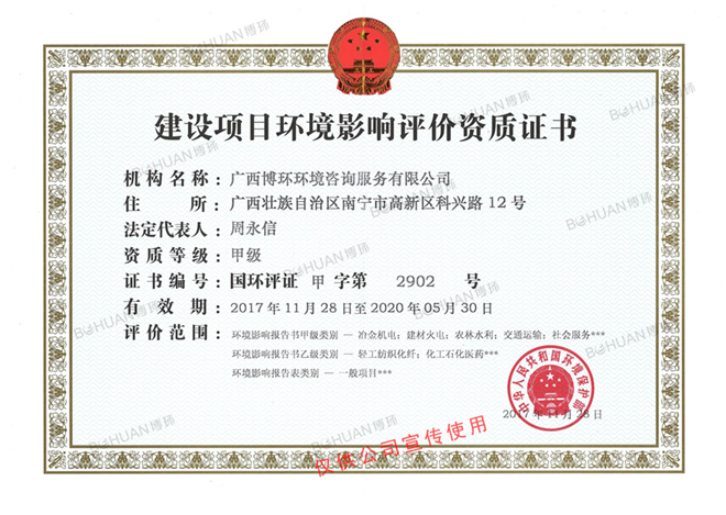 廣西博環環境咨詢服務有限公司系國有控股上市公司博世科( 股票代碼:300422)控股子公司,總部位于廣西南寧市,持有原生態環境部頒發的甲級建設項目環境影響評價資質證書(證書編號:國環評證甲字第2902號)、環境咨詢(環保管家)服務一級認證證書、環保工程專業承包叁級證書。公司是國家高新技術企業、 廣西科技型中小企業、廣西工業節能與綠色發展評價中心、廣西工業固體廢物資源綜合利用評價機構、廣西排污許可工作技術單位、廣西新增戰略性新興產業企業、廣西瞪羚企業、南寧市“專精特新”中小企業等。
